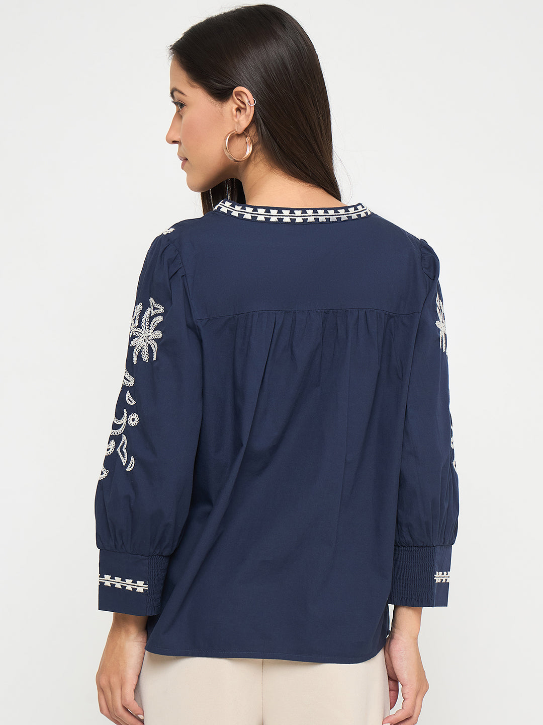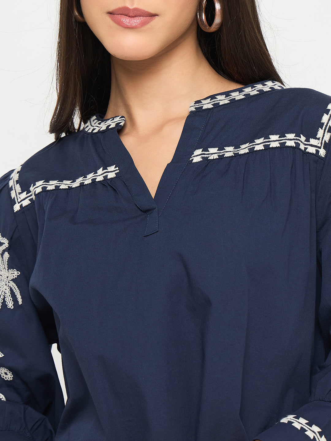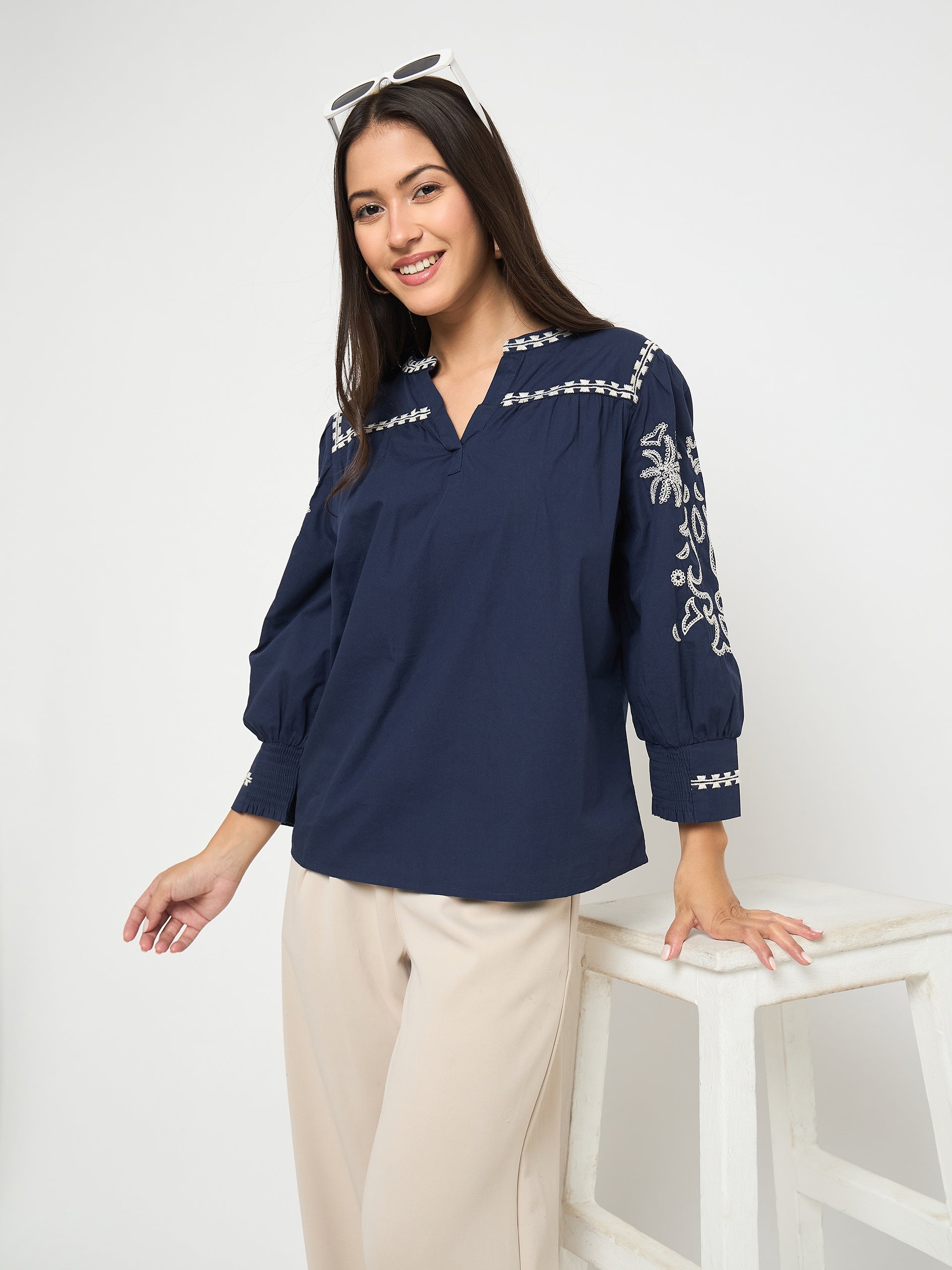 Elegant embroidery and a split crew neck elevate this navy cotton top with subtle charm. Perfect for casual dinners or day outings, pair with trousers or denim.