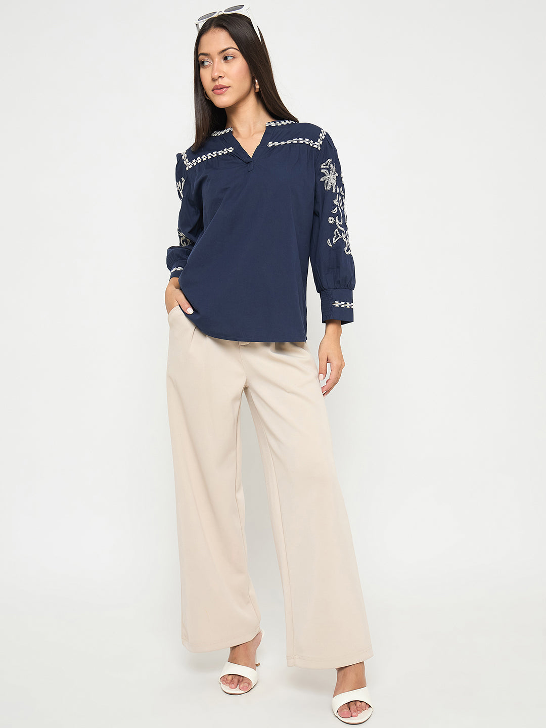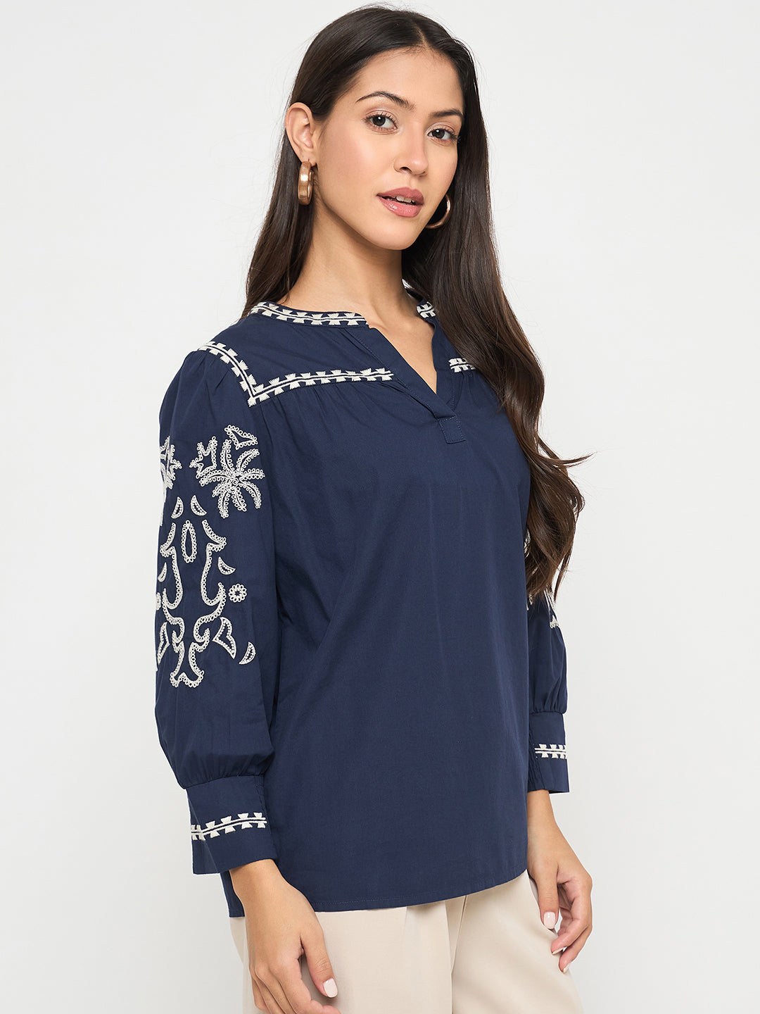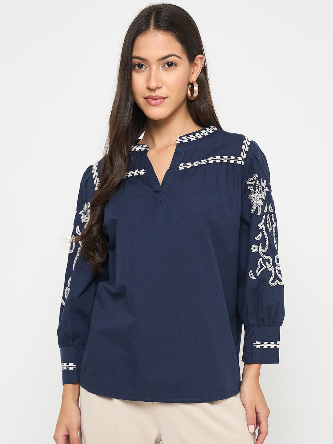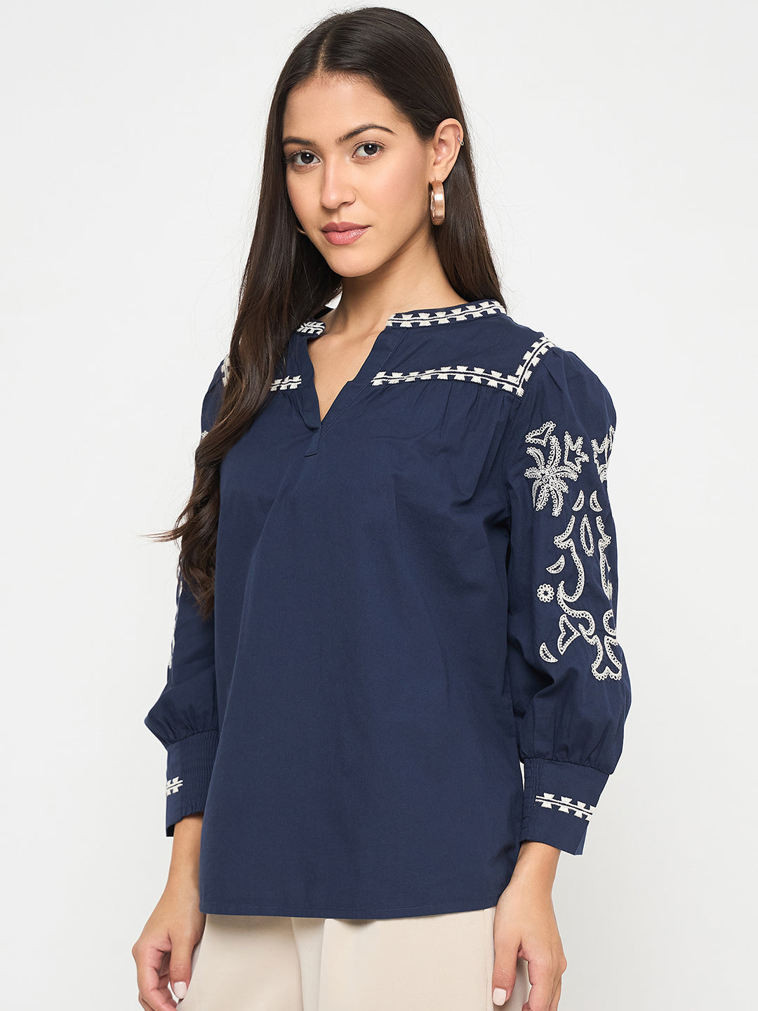 Elegant embroidery and a split crew neck elevate this navy cotton top with subtle charm. Perfect for casual dinners or day outings, pair with trousers or denim.