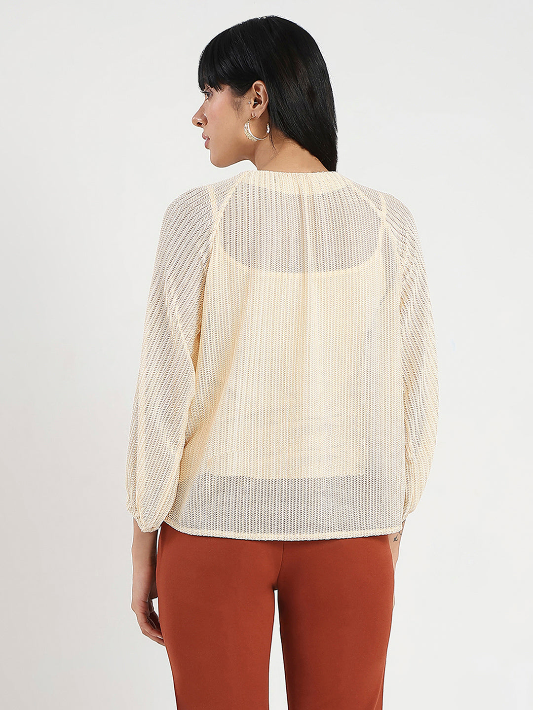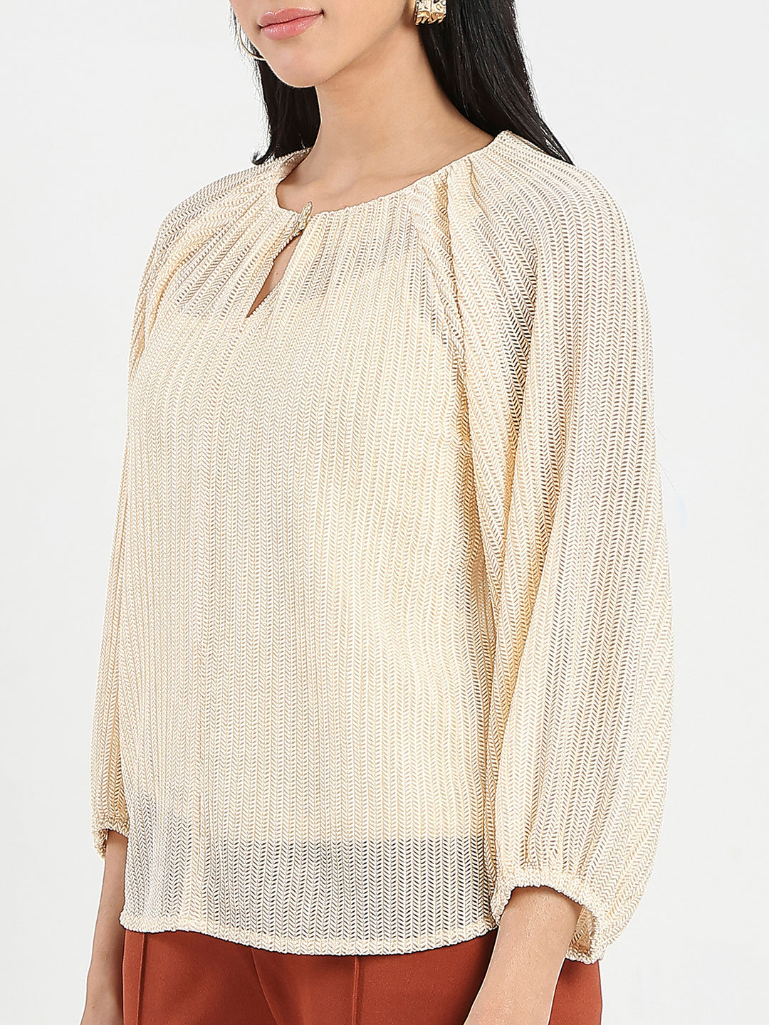 Add luxe with this beige beauty. The fancy knit fabric hugs you, while the pattern brings a playful texture that stands out with a gold buckle at the neck.