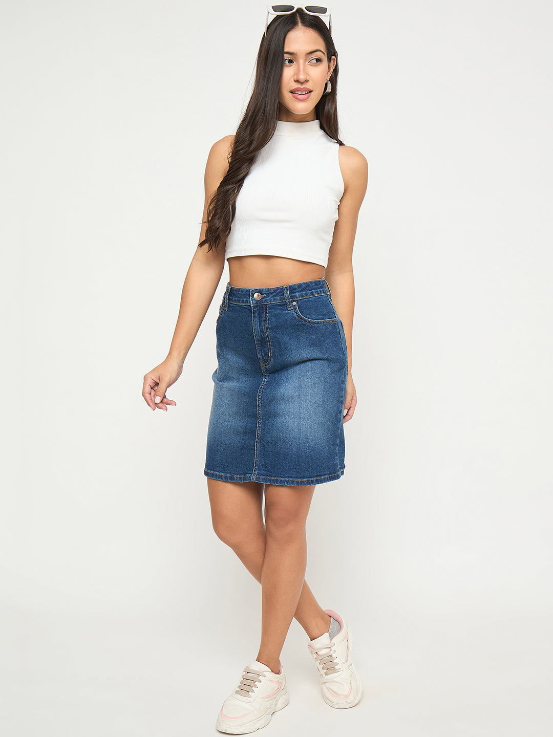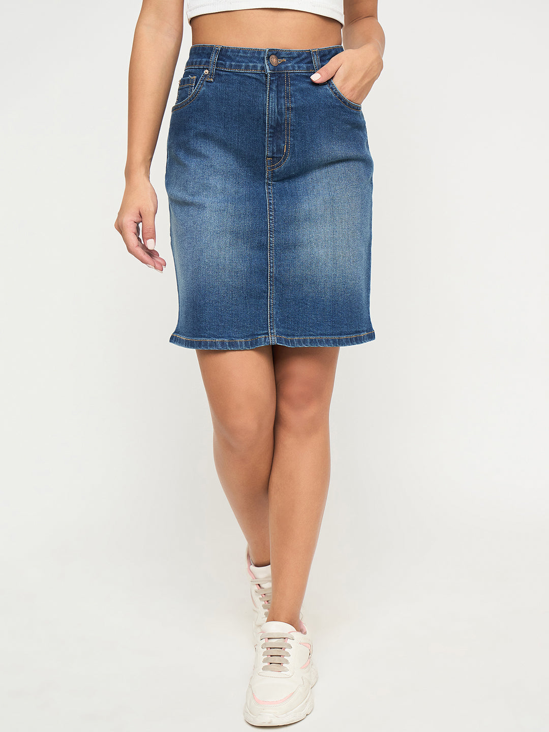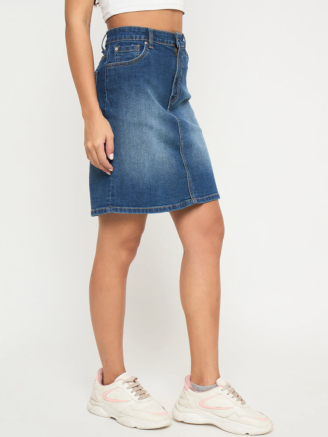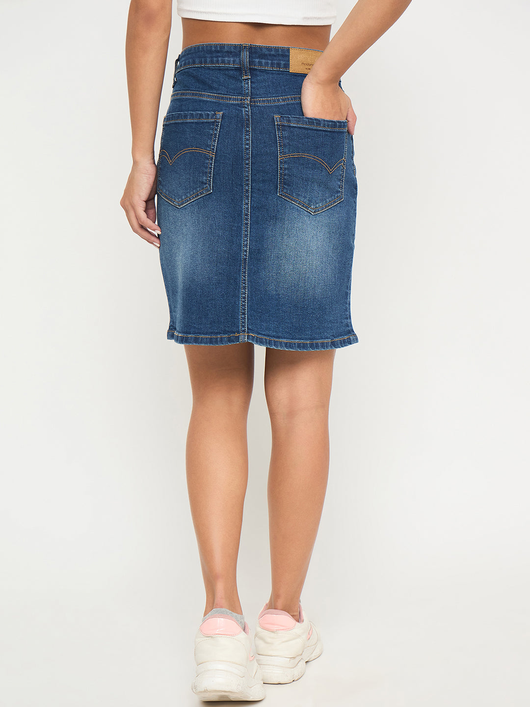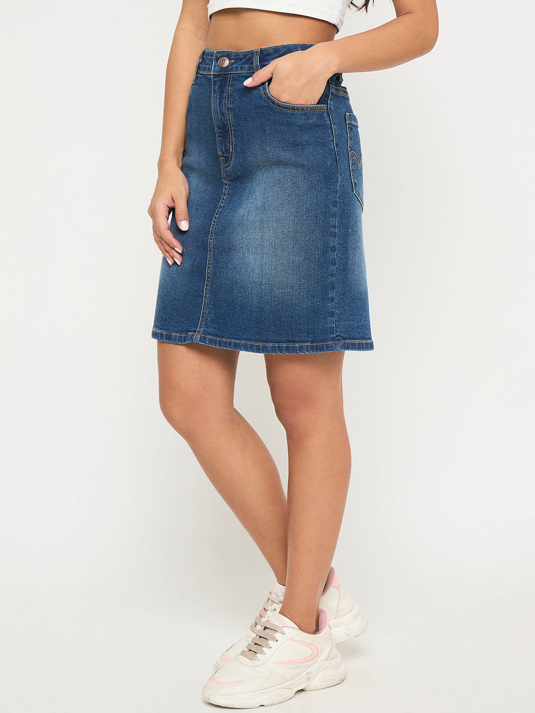 Madame Stone Wash Mid Blue Cotton Blend Mini Denim Skirt