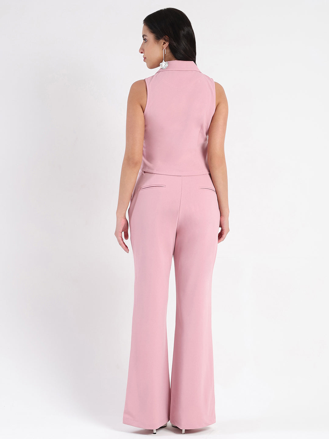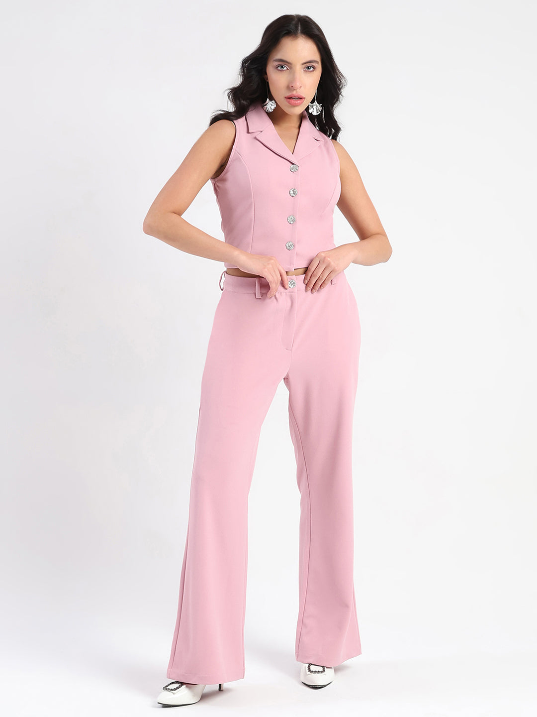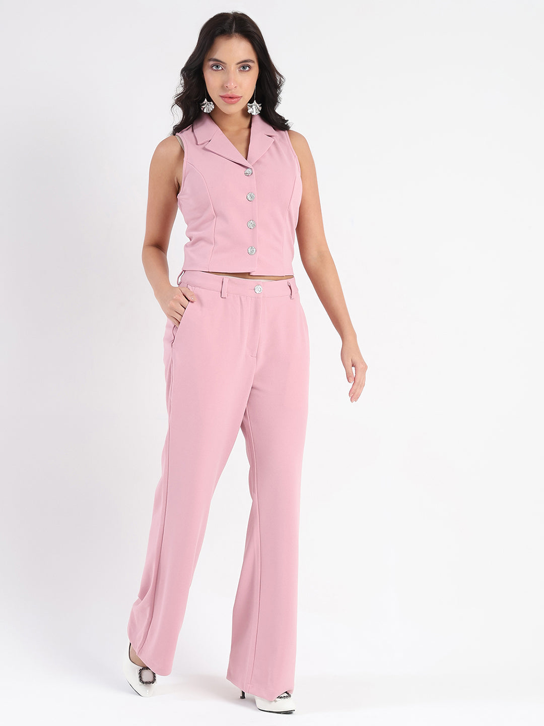 Turn heads with this blush set featuring a front-opening crop top paired with side-slit trousers. The soft, delicate hue of the set creates a feminine look.